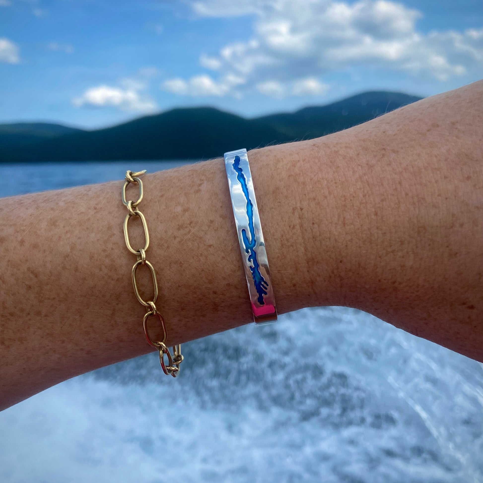 The same great 1/4" cuff you have come to love but with a resin lay that echoes the beauty of the blue water of Lake George. Each 1/4” sterling silver resin inlay bracelet cuff is individually crafted. The bracelet’s blue color will vary and thus reflects the individual and handmade nature of Sara’s work.